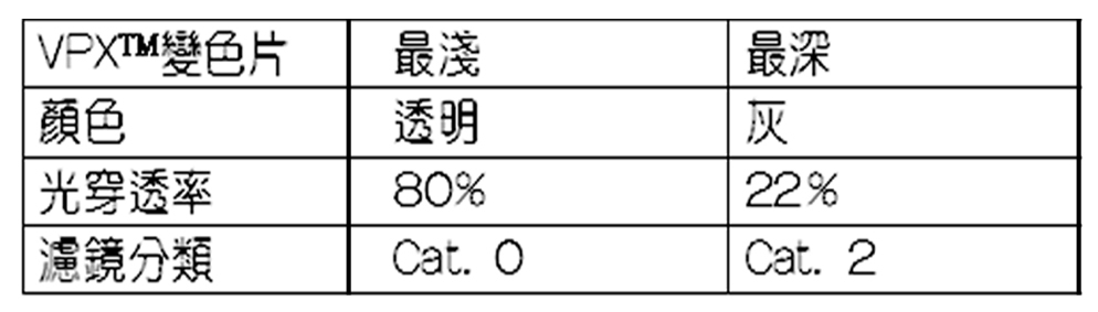 使用聚酸碳脂鏡片, 能在8秒內感光UV強弱度由淺變深,且變色分明不留殘色。超輕、超清晰、超耐撞擊的卓越鏡片功能, 非坊間一般變色片所能相提並論。不僅抗UV,眼睛受到光照的負擔更大大減少, 讓您久戴無負擔與無視覺疲勞。除此之外, 超安全, VPX使用特殊PC材質及工法製造, 並通過美國ANSI Z80.3測試, 歐盟EN1836, 澳洲AS1337及台灣CNS15067標準 。